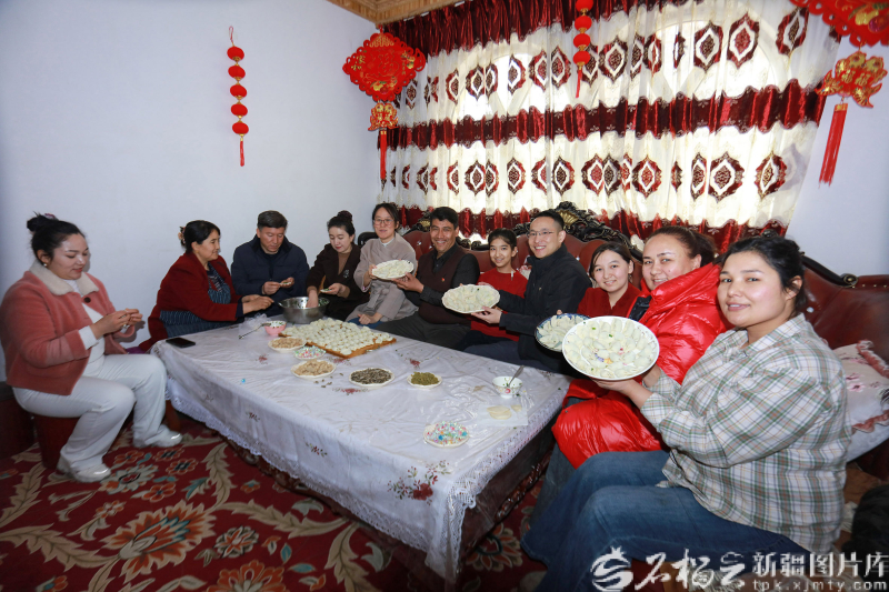 和田地区生态环境局洛浦县分局驻洛浦镇多鲁吐格曼贝希村工作队队员与村民一起欢度除夕,其乐融融。买买提艾力·艾尼瓦尔摄