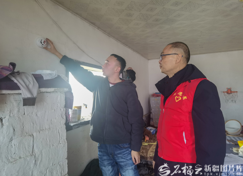 和布克赛尔县巴音敖瓦乡东泉社区工作人员和驻社区工作队队员为冬牧场牧民安装一氧化碳报警器。何承强供图