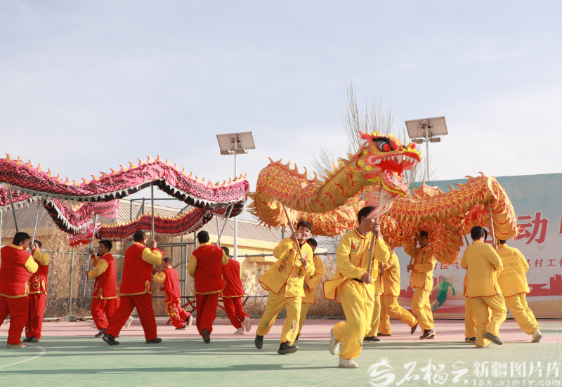 新疆气象局驻伽师县克孜勒苏乡约勒其村工作队组织文艺爱好者排练舞龙,准备社火表演。刘祥铭摄
