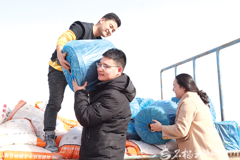 新疆生产建设兵团第二师驻尉犁县塔里木乡琼库勒村工作队队员帮助村民搬运春耕物资。杨进摄