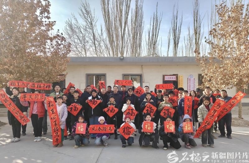 新疆艺术学院驻岳普湖县阿其克乡努开勒村工作队队员,与该院书法专业师生、村民合影留念。霍泠屹摄