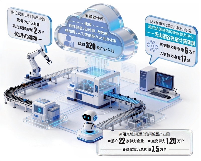 天山网-新疆日报记者 于江艳 2026年自治区政府工作报告提出:积极培育新质生产力,深入推进数字新疆建设,实施制造业数智化转型行动,积极融入国家“东数西算”工程,加快“疆算入渝”步伐,推进绿色智算中心、算电协同等智能新基建工程,打造绿色低碳高效全疆算力一张网。 作为新疆经济主战场、工业发展主阵地,新疆各地开发区及园区正深入推进数实融合,积极拥抱“人工智能+”,以新基建夯实高质量发展“底座”。 数字园区提速发展 春节大假刚过完,新疆塔城(托里)绿碳智算产业园内已是一派忙碌景象,算力投资企业正忙着规划设计、安装设备、异构组网。 “园区已落户22家算力企业,点亮算力1.25万P,备案算力总规模7.5万P,预计今年能建成3万P。”托里县商务和工业信息化局党组书记、副局长马战海说,抢抓“人工智能+”机遇,算力企业正加快建设项目进度。 依托丰富的绿电资源、年平均气温6—7摄氏度的凉爽气候以及低成本地价优势,托里县成为算力项目投资洼地,仅两年时间这里就崛起一座算力新城,吸引央国企及行业头部企业落户。 在托里县加快智能新基建建设的同时,地处天山东北部的伊吾县也在以“跑步冲刺”的速度,为“人工智能+”夯实算力“底座”。 抢抓“东数西算”工程、“数字丝绸之路”重大机遇,哈密市系统布局算力产业,在伊吾县规划占地1400亩,建设集智算产业集聚区、园区生活配套区、数算产业孵化区、产业发展服务区于一体的哈密(伊吾)算力创新示范区。目前,已建成占地3.5万平方米全国领先的单体算力中心——天山智谷先进计算集群,规划算力规模超6万P,为入驻企业提供配套定制楼宇、基础设施等支持。 截至2026年1月底,该创新示范区已入驻算力企业17家,1.45万P高性能智能算力正在组网,7500P算力已投入使用。 如果说,煤炭煤化工是伊吾县一张名片的话,那么现在伊吾县又多了一张新名片——智算。 克拉玛依云计算产业园和新疆软件园作为2012年批准设立的园区,也是新疆最早布局算力和数字经济产业的园区。 克拉玛依云计算产业园率先建成全疆首个算力规模超万P的产业集群,截至2025年末,算力规模突破2万P,位居全疆第一、西北前列,石油之城正转变为算力新城。 新疆软件园作为全疆唯一的自治区级软件与信息技术产业园区,已建成软件信息、云计算、大数据、物联网、人工智能等六大生态体系,吸引320家企业入驻。 同样在南疆,中国·皮山数字经济产业园、疏勒齐鲁数据服务产业园等,近年来也相继崛起。 数实融合深入推进 2月初,昌吉市银装素裹,而昌吉国家农业高新技术产业示范区(以下简称“昌吉农高区”)的智慧农业科技馆内,却是一派春意盎然景象,馆内菠菜、生菜、油麦菜等叶类蔬菜长势旺盛。 与传统农业种植不一样的是,这里的蔬菜种在营养液里,采用立体架式种植。“馆内的环境采集箱里有传感器,可实时采集温度、日照、二氧化碳等数据,智能环境管控系统根据这些数据,为每一种蔬菜精准定制营养液,智能灌溉系统将营养液精准滴灌到每一株蔬菜根部。”该智慧农业科技馆的运营企业——中农金旺(北京)农业工程技术有限公司运营总监闫冀说。 该智慧农业科技馆种植有30余种叶菜,以及辣椒、黄瓜、西红柿等茄果类蔬菜,向全疆输出农业种植新技术,发挥示范引领作用。 推动传统农业向数字农业转型,昌吉农高区内的新疆慧尔农业集团股份有限公司,开发出慧尔智慧水肥一体化技术,通过物联网等技术,实现农业种植智慧滴灌,服务农田面积超500万亩,使农业种植不仅节水节肥,还节省人工,亩均增收约200元,取得显著社会经济效益。 作为国家第十四个大型煤炭基地的核心组成部分,新疆准东经济技术开发区(以下简称“准东开发区”)拥有中国最大整装煤田。推动数实融合,准东开发区的矿业企业批量引进无人驾驶矿卡。目前,每天数百辆无人驾驶矿卡奔驰在煤矿,运输煤炭、渣土等。 国网能源新疆准东煤电有限公司准东煤田大井矿区二号矿是全国首批智能化示范煤矿。“十四五”期间,该公司配套投入3.3亿元,建设云计算数据中心、生产指挥控制中心、生产集中控制平台等共计65个子系统,通过自动化和远程监控技术,实现水泵房、压风机房、变电所等固定岗位无人值守,显著降低作业风险和劳动强度。 以数智技术赋能井工矿井生产,一线采煤工从“前线”转移到“后方”,变成机器设备的“统领者”。“准东煤田大井矿区二号矿井深500米,井底生产画面实时传输到智控中心显示屏上,工人坐在智控中心远程开展煤炭采掘、运输等作业。”国网能源新疆准东煤电有限公司矿长方珍珠说。 2025年11月,工业和信息化部办公厅印发的《高标准数字园区建设指南》明确,到2027年,建成200个左右高标准数字园区,实现园区规上工业企业数字化改造全覆盖。当前,新疆各园区工业企业数实融合正深入推进,生产场景加速焕新。 数智赋能服务升级 为了推进通关便利化,服务高水平对外开放和高质量发展,2025年,自治区商务厅等九部门印发《新疆维吾尔自治区智慧口岸建设实施方案》,该方案要求部署建立智慧口岸运行管理平台,研究搭建自治区智慧口岸运行管理联合调度指挥平台,深度应用AR实景、三维地图等技术,推动公安、海关、边检、运管等口岸相关部门数据分级共享,形成口岸全要素数据“一个库”;采用