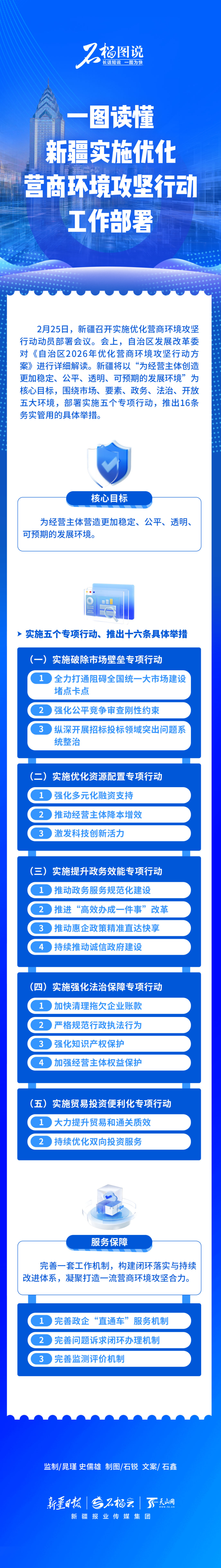 2月25日,新疆召开实施优化营商环境攻坚行动动员部署会议。会上,自治区发展改革委对《自治区2026年优化营商环境攻坚行动方案》进行详细解读。新疆将以“为经营主体创造更加稳定、公平、透明、可预期的发展环境”为核心目标,围绕市场、要素、政务、法治、开放五大环境,部署实施五个专项行动,推出16条务实管用的具体举措。