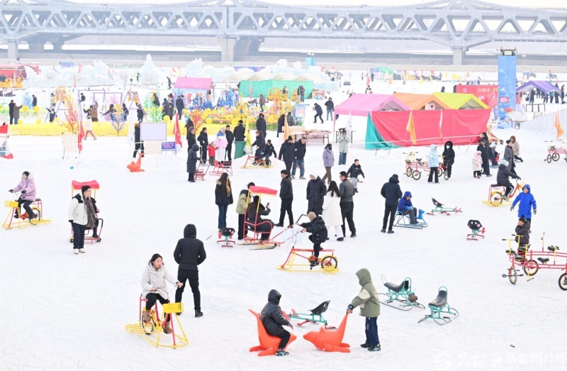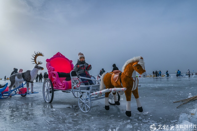 在和硕县博斯腾湖金沙滩景区,游客体验冰上乐趣。韩峻摄