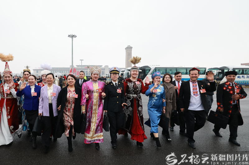 3月5日,十四届全国人大四次会议在北京人民大会堂开幕。图为新疆代表团代表准备从驻地乘车出席开幕会。石榴云/新疆日报记者 崔志坚摄