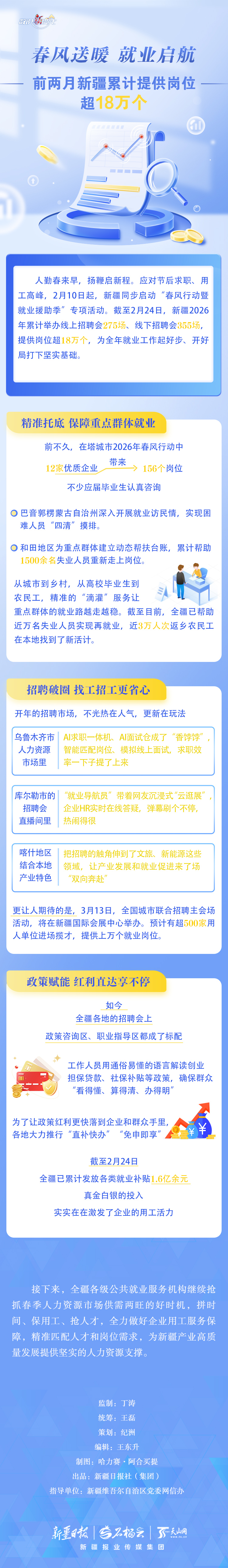 人勤春来早,扬鞭启新程。截至2月24日,新疆2026年累计举办线上招聘会275场、线下招聘会355场,提供岗位超18万个,为全年就业工作起好步、开好局打下坚实基础。就业是民生之本,新疆各级公共就业服务机构在保用工、引人才方面做了哪些努力?今天的《数说“新”变化》一起来看看。
