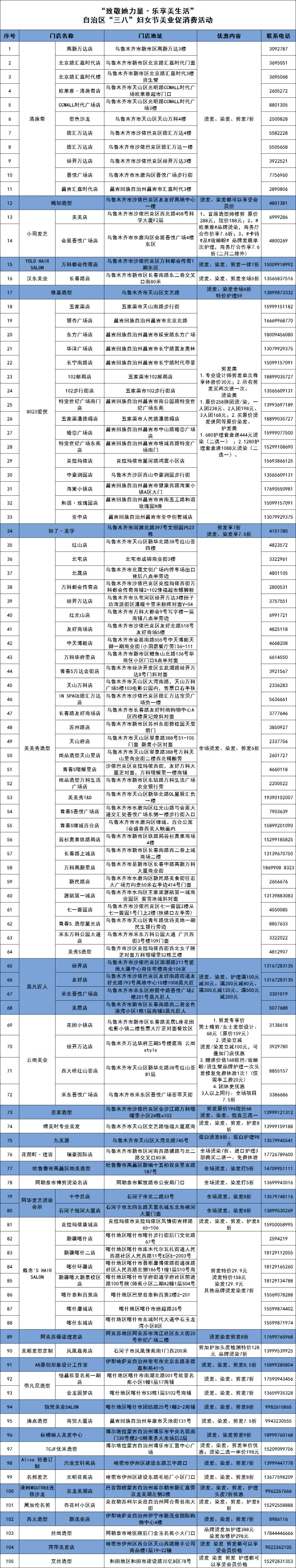 参与自治区“三八”妇女节美业促消费活动的商户名单。(点击可放大) 责任编辑:拉拉·海力