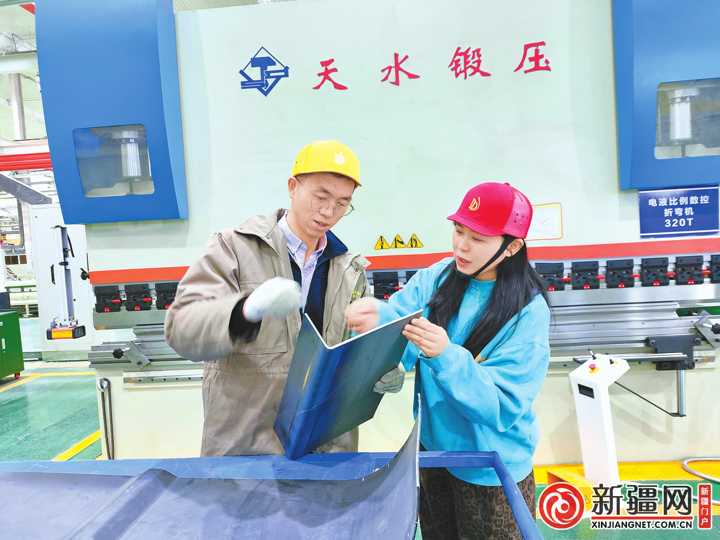在两河高端制造科技产业园的中厚板容器载具“共享工厂”,乌鲁木齐晚报记者唐红梅(右)在折弯环节了解折弯后的产品。