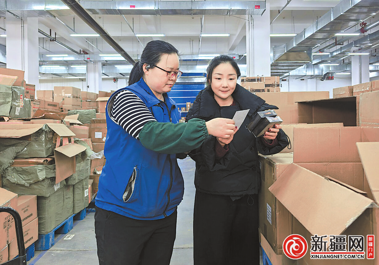2月12日,乌鲁木齐晚报记者王璇(右)与邮政八道湾云仓分拣员白雪梅,一起体验云仓是如何快速发货的。