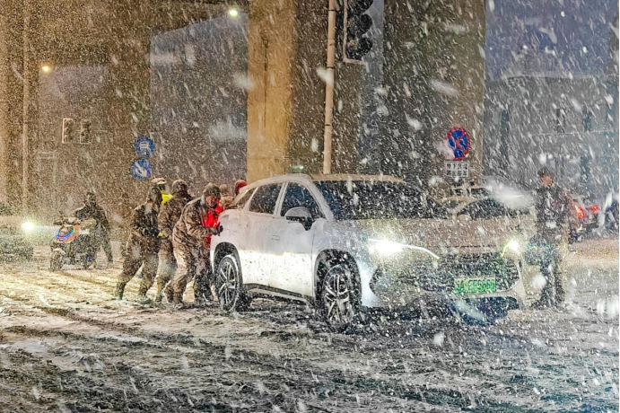 3月11日晚,新疆乌鲁木齐市出现特强寒潮,强降雪导致部分道路积雪结冰,车辆通行受阻驻地官兵展开救援行动。 罗成摄 “1、2,加油推!”现场呐喊声此起彼伏。官兵们不畏严寒、并肩作战。大家分工明确、配合默契,清雪除障、推车救援、疏导车流,全力保障道路通行安全并提醒驾驶员减速慢行、谨慎驾驶。