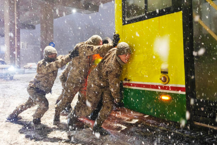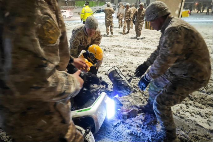 3月11日晚,新疆乌鲁木齐市出现特强寒潮,强降雪导致部分道路积雪结冰,车辆通行受阻,驻地官兵展开救援行动。 罗成 摄 “雪情就是命令!”驻新疆某部朱建伟说道。为全力保障人民群众生命财产安全和道路通行秩序,部队官兵闻令而动、迅速集结,与驻地交警密切配合,高效开展被困车辆救援、交通秩序维护、积雪清理等应急处置工作。