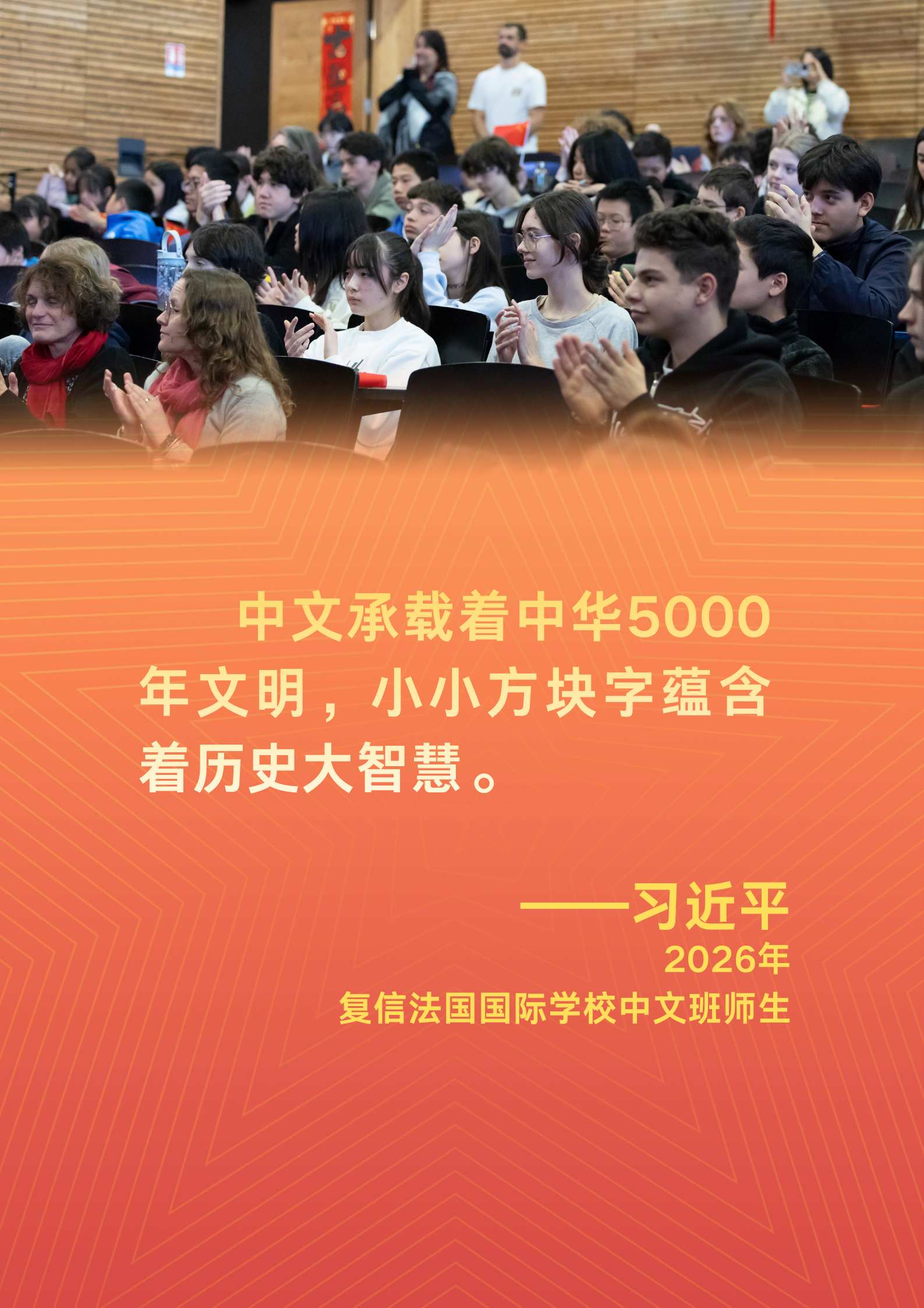 在给习近平主席的信中,中文班师生代表分享学习中文的体会和对中国文化的喜爱,表达增进中法青少年交流、深化中法传统友谊的积极意愿。