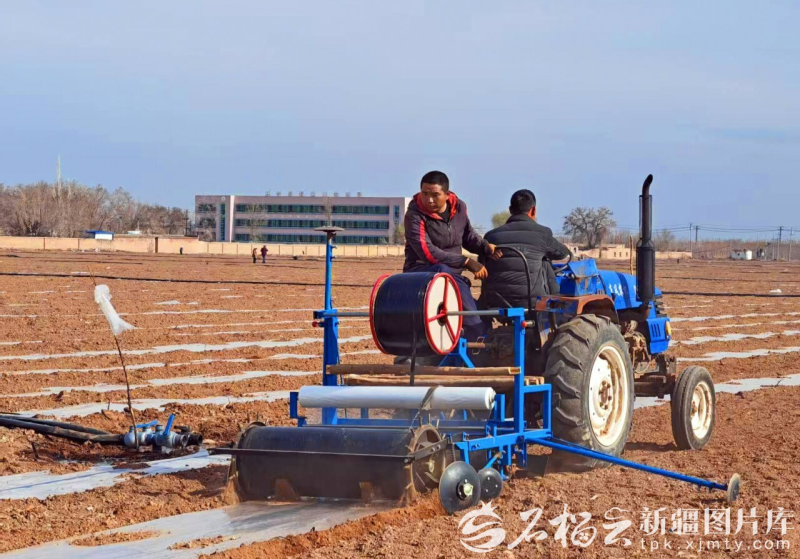 3月12日,呼图壁县二十里店镇春耕现场,拖拉机牵引覆膜播种设备在田垄间作业,高效推进春播生产。玛丽娜·波拉提摄