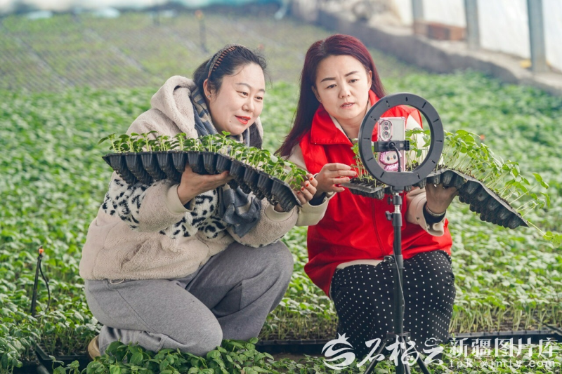 3月11日,乌苏市八十四户乡工作人员走进巴海村蔬菜育苗合作社温室大棚,化身“村播” 直播推介辣椒、茄子等优质菜苗。李仁锡摄