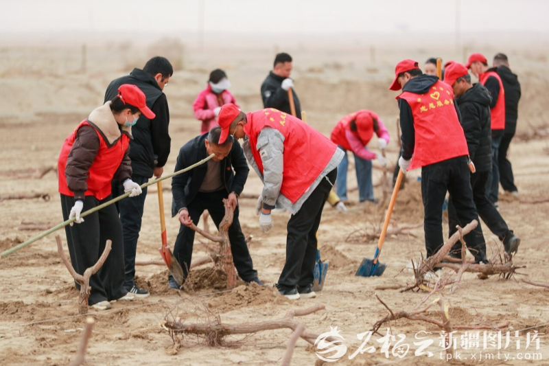 3月12日,洛浦县2000余名干部职工、志愿者在拜什托格拉克乡植树点栽种枣树,当日完成义务造林180亩。买买提艾力·艾尼瓦尔摄