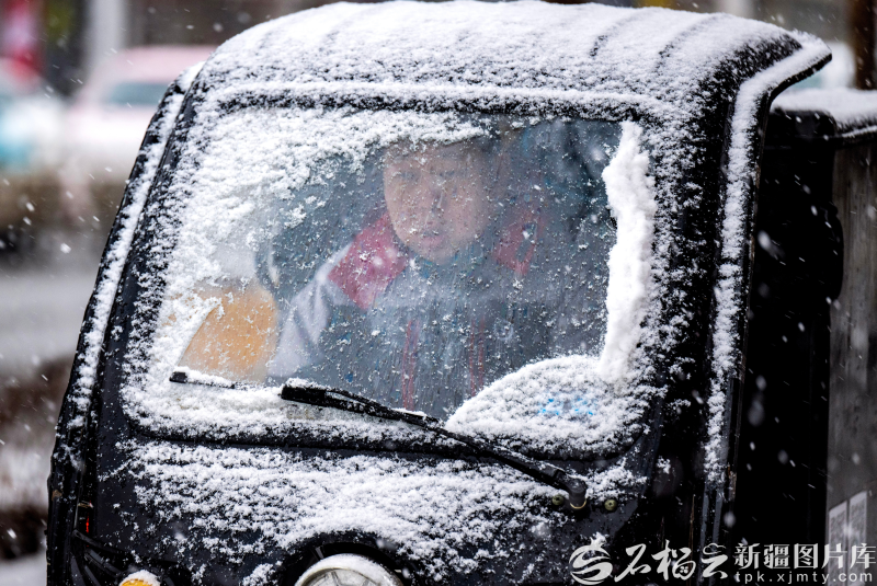 3月11日,昌吉市,一名快递员驾车在漫天大雪中缓慢前行。风雪凛冽,无数身影默默坚守,用担当守护着城市的温暖与安宁。何龙摄 菜篮无忧