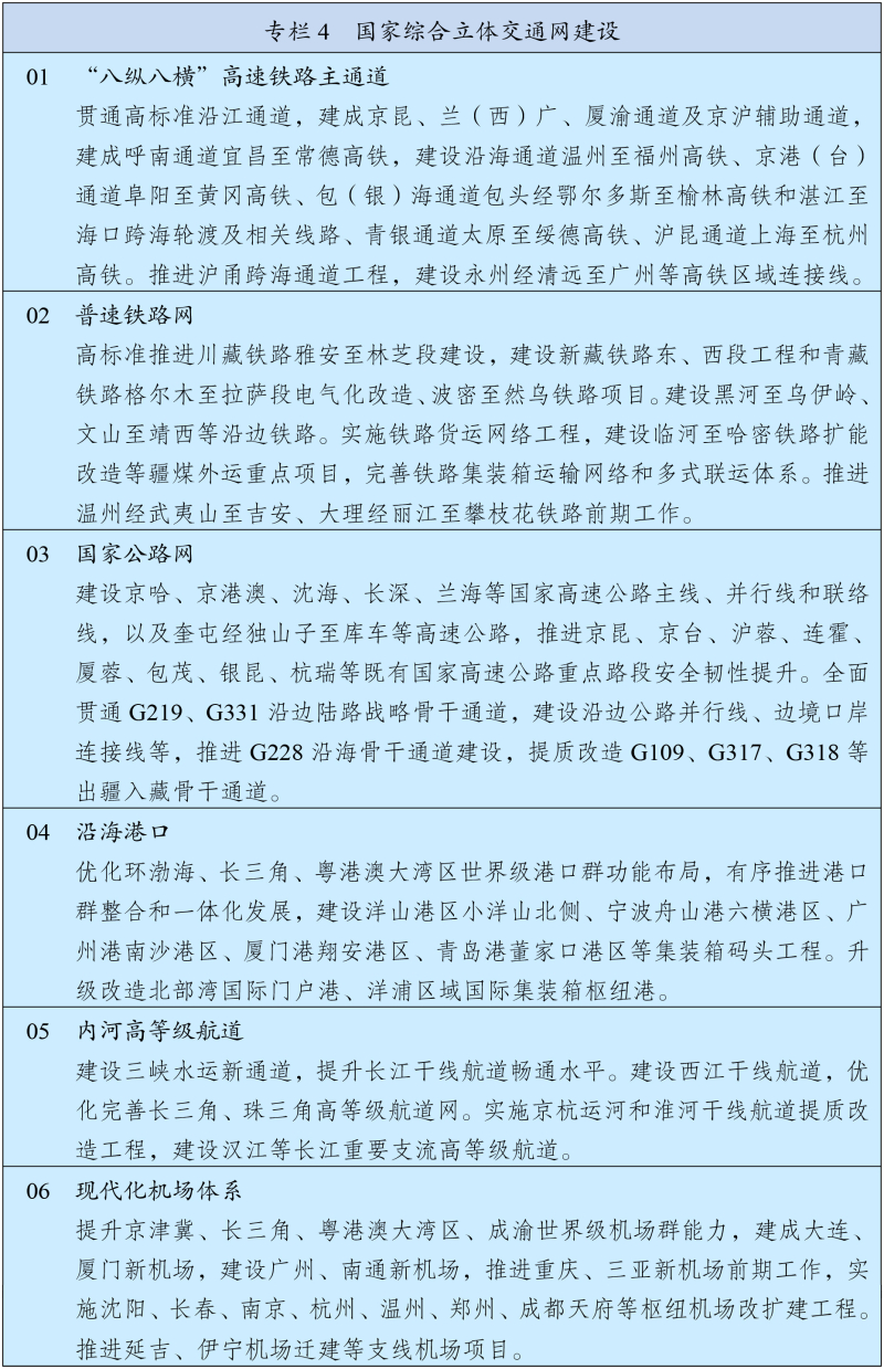 规划纲要以专栏形式明确国家综合立体交通网建设的6项重大工程,其中“国家公路网”项目提及要建设京哈、京港澳、沈海、长深、兰海等国家高速公路主线、并行线和联络线,以及奎屯经独山子至库车(以下简称“独库高速公路”)等高速公路。