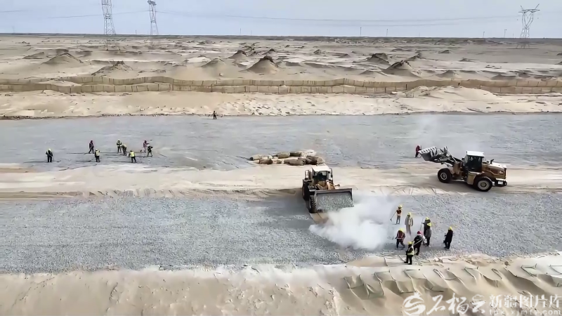 在“疆电外送”第四通道电源项目新能源部分生态治沙工程现场,建设者们在风沙中奋战。巴音郭楞融媒体中心供图