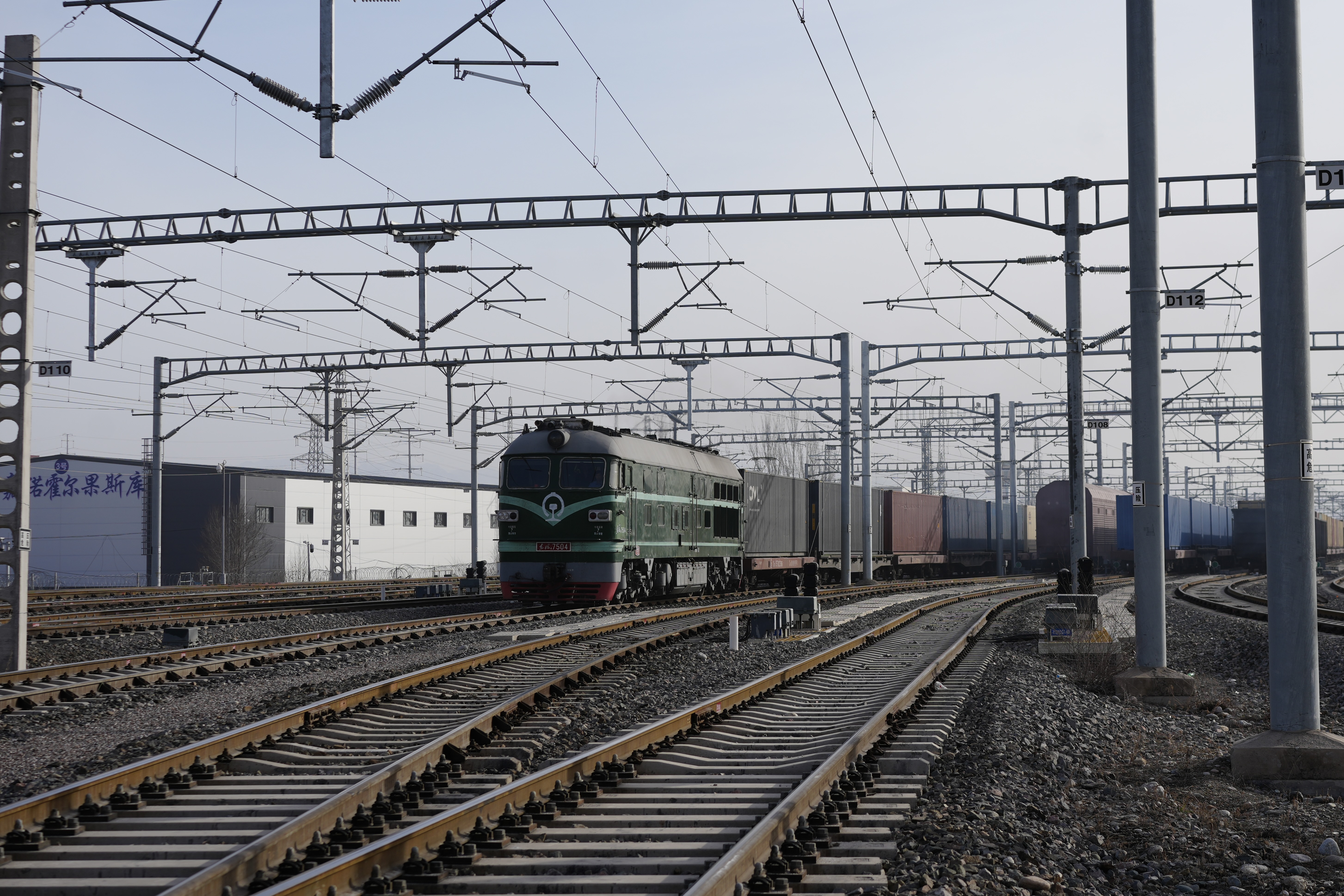 在阿拉山口铁路综合查验场,龙门吊巨臂日夜挥舞,一列列满载电子产品、日用百货的中欧班列完成换装、验放后,鸣笛西行。