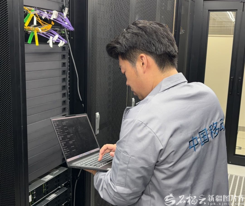 国家顶级域名(新疆)解析节点上线前,中国移动(新疆昌吉)数据中心工作人员进行网络调测。刘仰供图