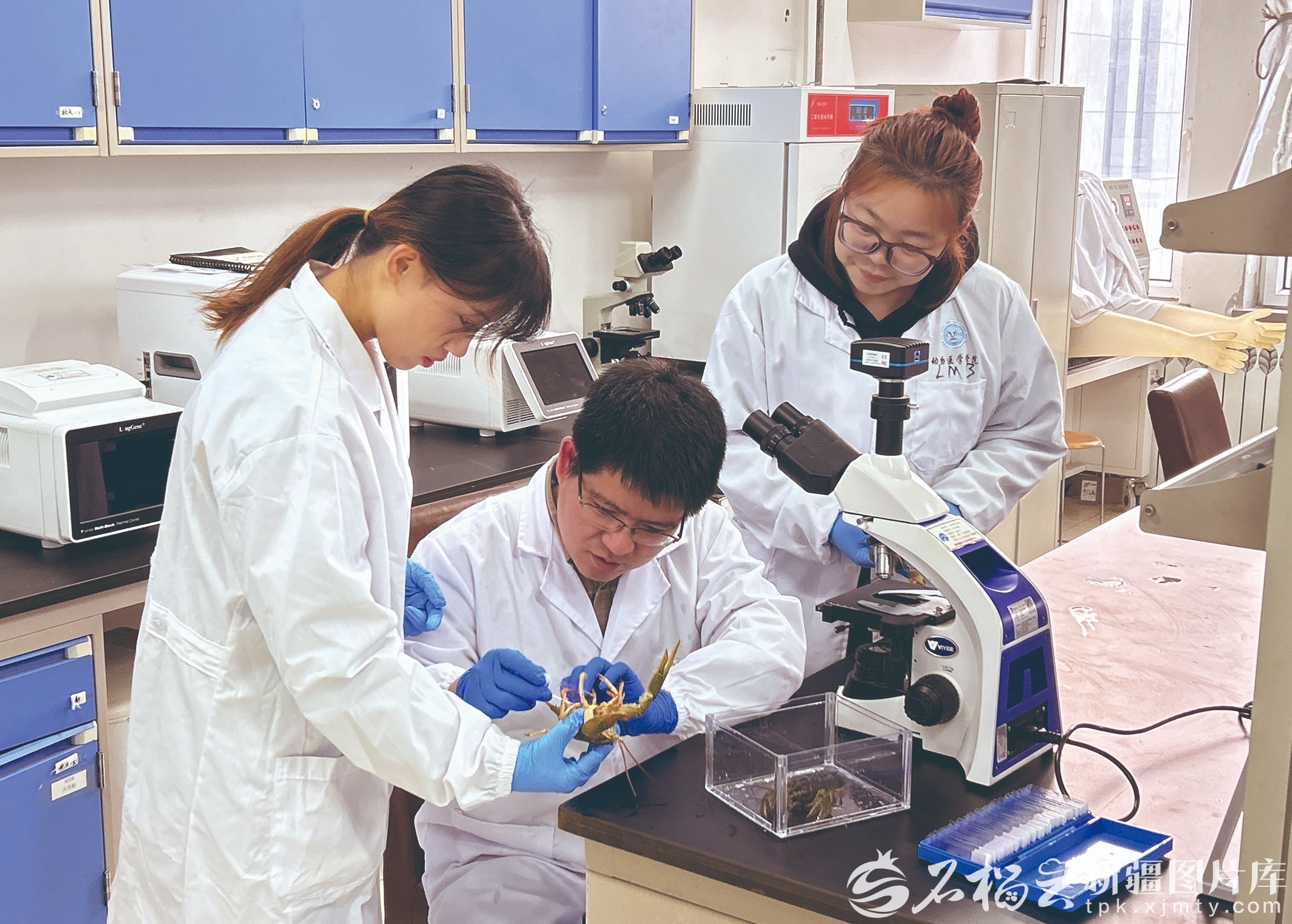 1月29日,在新疆农业大学动物医学学院实验室,新疆吉木乃窄螯螯虾科技小院师生正在观察螯虾性腺组织切片。张格 摄 团队成员赵琪挽说:“我们的论文,要写在祖国最需要的地方;我们的成果,要让边疆的土地更富饶。” 视线转向塔克拉玛干沙漠西南边缘的麦盖提县,这里沙漠面积约占全县总面积的90%。2020年,山东日照职业技术学院水产养殖技术专业师生团队提出了一个大胆设想——“在沙漠里养殖海鲜”。此后,一批批师生接力奔赴新疆,硬是在黄沙边缘“凿”出一条新路。 “在沙漠养龙虾,过去想都不敢想。”日照职业技术学院海洋技术系教师付宁坦言。初到麦盖提县吐曼塔勒乡,他发现这里虽处沙漠,却紧依叶尔羌河,闲置滩涂池塘资源丰富。 “把山东的水产养殖技术‘嫁接’过来,再根据当地实际进行适应性改造。一旦成功,就能规模化推广,真正造福百姓。”当付宁将设想与山东日照市援疆工作指挥部沟通时,双方一拍即合。 团队实地走访麦盖提县,结合当地水质、气候等条件,决定试养澳洲淡水龙虾。为进一步调控水质、改良技术、提高成活率,团队约20人索性把工作室搬到了大漠上,克服种种技术难题,终于实现在沙漠边缘养殖澳洲淡水龙虾的突破。2024年,团队又提出新设想——让龙虾苗在新疆实现自培自用。经过反复试验,一个保苗大棚终于在麦盖提县的土地上“长”了起来,大大降低了养殖成本。 为把技术真正留在新疆,付宁会同其他水产专家编写了《澳洲淡水龙虾养殖技术手册》,开设龙虾养殖培训班,培训致富带头人200多人。 科研工作者和青年学子用沾满泥土的双手,把复杂的技术变成了乡亲们听得懂的“家常话”,把高深的科研成果化作了看得见、摸得着的收成。他们不把自己当“专家”,只做各族群众身边的“自家人”,让科技的种子在边疆大地开花结果。 点水成金惠乡亲 说起新疆海鲜,多数人第一时间会想到尼勒克三文鱼。在尼勒克县喀拉苏乡的水库边,成群的三文鱼不时跃出水面。 “这可是我们的‘致富鱼’。”此前靠放牧谋生的尼勒克县喀拉苏乡村民吴斯班·阿拉勒拜,如今早已放下羊鞭学起养鱼,并熟稔冷水鱼养殖技术。 产业扎根背后,一个名为“新疆尼勒克三文鱼科技小院”的平台正持续赋能。 2023年5月,由新疆天蕴有机农业有限公司与新疆农业大学生命科学学院、新疆科协、伊犁哈萨克自治州科协、尼勒克县科协共同申报的“新疆尼勒克三文鱼科技小院”获批设立。科技小院聚焦渔业养殖“卡脖子”难题,从疫病防控、设备研发、副产品深加工到饲料营养配方,为全产业链提供技术支撑。 在尼勒克县,像吴斯班这样转型的农牧民有数百户。当地推广“企业+合作社+农户”模式,让百姓融入产业链。龙头企业带动600多名当地农牧民转型为产业工人,年收入从两万元左右提升至约八万元。 吴斯班说:“以前靠放羊维持生计,一年下来也就一万多元。如今每月有四千元稳定工资,还成了公司股东。不仅学会了养鱼,还考取了潜水员证,日子大变样。” 从北疆伊犁河谷一路向南,在和田县喀什塔什乡的高山峡谷间,鱼跃碧波的场景同样见证着当地农牧民生活的巨变。 “这些鱼苗是去年从成都引进投放的,养殖的水全部是昆仑山天然泉水,水质纯净还含有很多矿物质,最适合冷水鱼生长了。水温也有讲究,白天晚上都得稳定在6℃左右。”说起冷水鱼养殖,村民阿卜都力提·阿卜都热介甫头头是道。 喀什塔什乡平均海拔超2800米,高山矿泉水兼具高溶氧、低水温、水质优的天然优势,经专家实地调研,非常适合冷水鱼养殖。 2021年以来,和田县精准抓住这一特色资源禀赋,创新构建“公司+农户”规模化养殖体系,引进三文鱼、中华鲟、金鳟鱼等优质冷水鱼品种,推动冷水鱼养殖产业从“有”向“优”转变。 看中这里得天独厚的冷水资源,和田域见疆来水产养殖有限责任公司将养殖基地建在该乡克孜勒也尔村,在科研专家及技术团队的支持下,养殖规模达2000余尾,年产量4万公斤左右。凭借紧实鲜嫩的肉质,产品不仅畅销本地,更通过电商平台远销全国。产业的扎根,让不少像阿卜都力提一样的农牧民在家门口学到了技能、获得稳定收入。 “现在在养殖基地上班,跟着技术员学会了冷水鱼养殖,每月还有4000多元固定工资。”阿卜都力提说。 科研院所与企业将一项项技术转化为农牧民口袋里的真金白银,在这片离海最远的土地上,用科技的力量养出了“致富鱼”“发财虾”,各族群众在渔业饭碗里尝到甜头,日子更有盼头。 科技跨越山海,滋味联通万家。一尾尾游鱼、一只只鲜虾,不仅“端”稳了百姓的饭碗,更拉近了心与心的距离。当增收的喜悦绽放在各族群众脸上,守望相助的情谊便从这丰收的喜悦里流淌出来。在这片辽阔而深情的土地上,共同奋斗、共同富裕、共同奔向美好生活的脚步,正踏得更加坚定、更加有力。