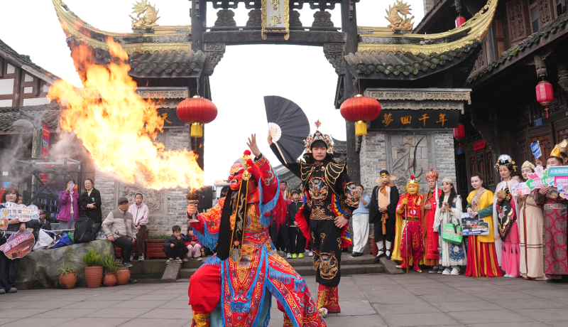 3月28日,川剧变脸、喷火精彩上演。吐鲁番市融媒体中心记者 谢懂飞 摄 活动现场,吐鲁番歌舞剧团带来的舞蹈《纳孜库姆》热情奔放,舞者以诙谐灵动的肢体语言展现了吐鲁番的独特魅力,瞬间点燃了当地群众的热情。 而潼南带来的花岩女子狮舞,以及川剧变脸、喷火等精彩表演,也让来自吐鲁番的各族群众大开眼界。演出尾声,两地演员与现场观众携手共舞,在欢快的节奏中融为一体,现场气氛热烈非凡。 “他们的表演非常精彩,我们在这样的交流中不断学习、加深了解。这种跨越地域的文化对话,我觉得一定会让双方都受益匪浅。”吐鲁番歌舞剧团副团长阿马尼古丽·亚生说。