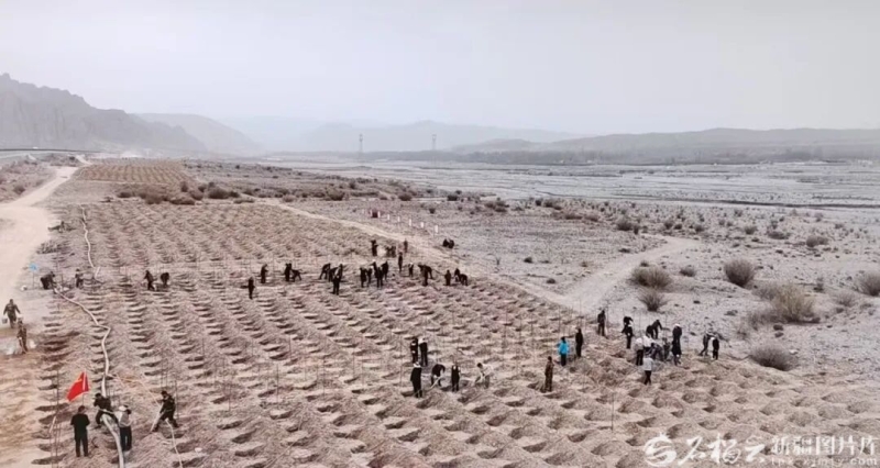 3月30日,乌恰县开展春季义务植树活动,为乌恰县建设再添新绿。乌恰县融媒体中心供图 在和田县植树现场,搭载北斗导航系统的专业植树机械往来穿梭,精准定位、规范挖坑、高效栽植,5秒即可完成一棵树苗的栽植工序,单日机械种植量近1.3万棵,相比人工栽植效率提升数倍。同时,当地推行机械种植与节水滴灌一体化模式,实现苗木栽植后即时浇水、精准补水,有效提高苗木成活率。 吐鲁番市高昌区总投资2367万元的生态修复项目,采用草方格固沙、滴灌保水、苗木补植等综合技术,科学恢复荒漠植被的防风固沙功能;阿克苏地区在农田防护林建设中,推广窄林带、小网格的造林模式,搭配滴灌、喷灌等节水设施,实现生态防护与节水增效有机结合;尉犁县在沙漠边缘造林中,采用“梭梭+肉苁蓉”套种模式,既提升沙漠绿化面积,又带动群众发展沙产业,让科学造林成为生态改善与群众增收的纽带。 此外,新疆各地还探索建立“种植—管护—验收—追责”全流程管控体系,实行造林地块实名制管理,明确管护责任人、管护期限与管护要求,做到造管结合、权责明确,确保造林工作落地见效,让每一片新绿都能成为守护新疆生态的坚实屏障。 生态惠民,绘就绿色发展新篇 植树造林,既是筑牢生态屏障的生态工程,也是推动绿色发展的民生工程。新疆将植树造林与生态保护、产业发展、民生改善紧密结合,让各族群众在植绿护绿中共享生态红利,实现生态效益、经济效益与社会效益的有机统一。