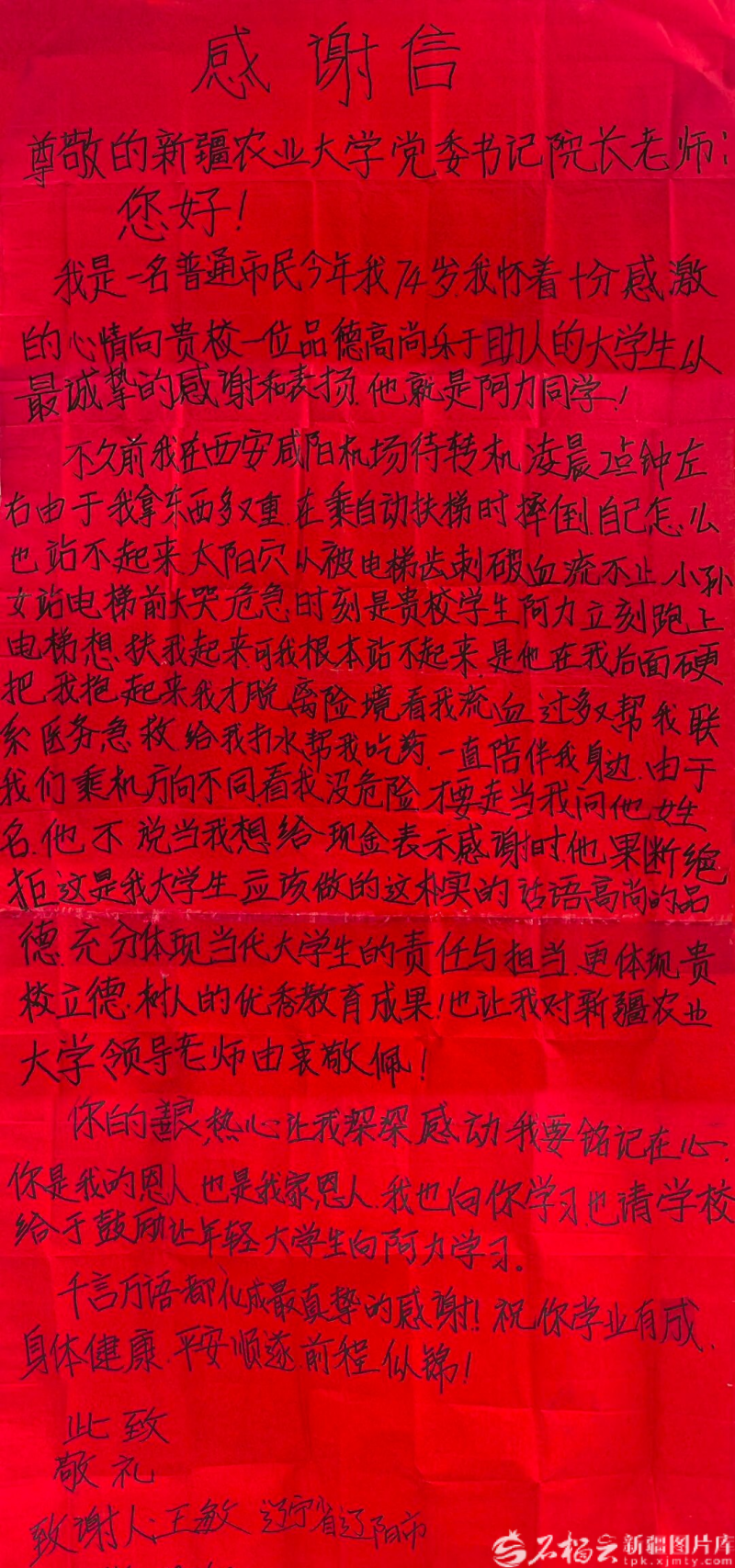 王敏老人写给新疆农业大学的信,讲述了自己危难之时,阿力木江·阿不都吾甫尔热心相助的事。新疆农业大学供图 1月22日深夜,西安咸阳国际机场候机厅,王敏在自动扶梯上不慎跌倒,一时无法起身。就在此时,一个年轻的身影冲了过来…… “小伙子穿着朴素,话不多,力气却很大。”王敏回忆,小伙子二话没说,一把将她抱起,又一路陪着她找到机场医务人员,忙前忙后地止血包扎、喂药喂水,确认她无大碍后才匆匆离去。临别前,她再三追问,小伙子仍不肯透露姓名。后来她通过联系机场医务人员才知道,小伙子是新疆农业大学的学生,叫“阿力”。 王敏记住了“新疆农业大学”六个字。回到辽宁后,她时常想起这个个子不高、眼睛大大的小伙子。思索良久,她提笔写下一封感谢信,挂号寄往新疆农业大学。 收到信后,学校拨通了王敏的电话。沟通中,她反复说着同一句话:“我想请学校帮我找到这位同学,替我当面说声谢谢。这样的好孩子,应该让更多人知道。”