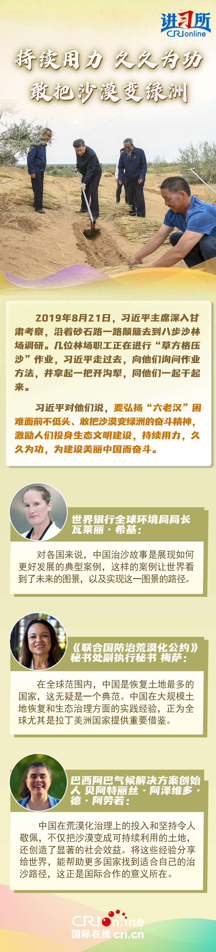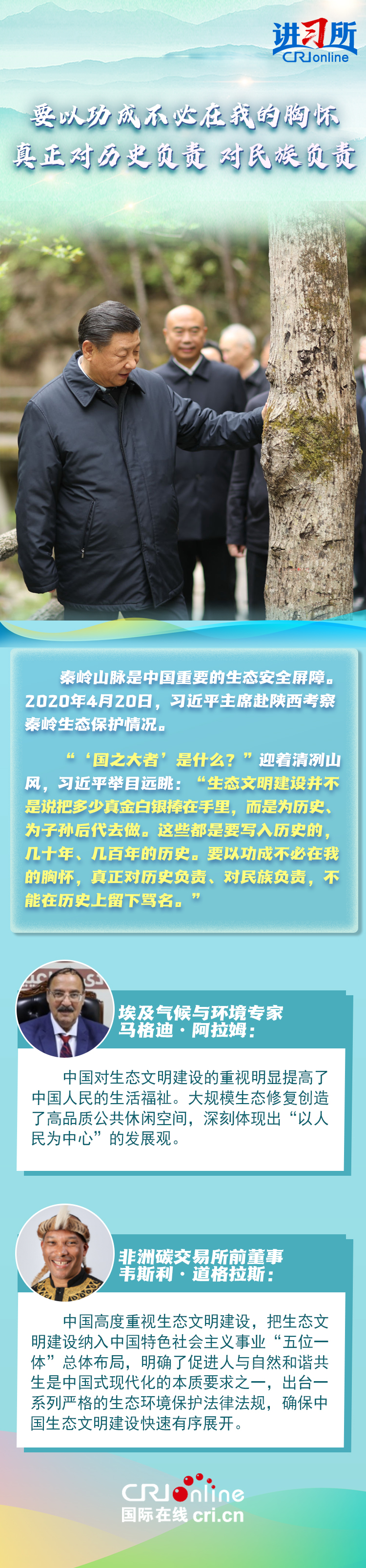 【本期导读】 良好的生态环境是最公平的公共产品,是最普惠的民生福祉。3月30日,中国国家主席习近平在北京参加首都义务植树活动时强调,植树造林是美丽中国建设的一项重要任务,要咬定青山不放松,立足当下、着眼长远、接力奋进,把这件利国利民的大事扎实做好。 中共十八大以来,中国森林面积和蓄积量持续“双增长”,荒漠化和沙化土地面积持续“双缩减”,是全球增绿最多最快的国家。习近平主席始终身体力行:在北京连续14年参加首都义务植树活动,在甘肃与林场职工一起进行“草方格压沙”作业,在陕西亲自“验收”秦岭生态保护…… 国际社会认为,中国对生态文明建设的重视明显提高了中国人民的生活福祉,其实践经验正为全球提供重要借鉴。    监制:陈刚、戴爽、金近 策划:张倩楠 文案:任丽君 视觉:陈佳杰 校对:娄珂馨、位树理