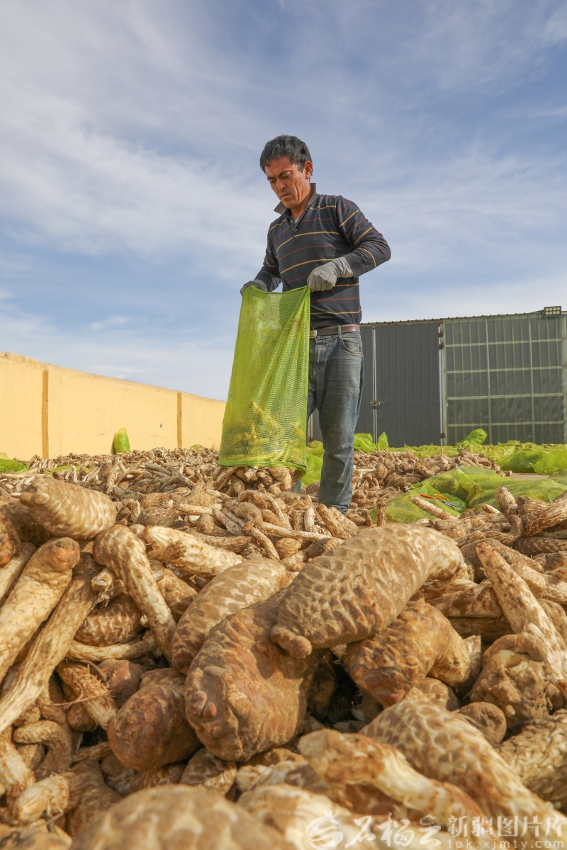 2025年5月8日,农户晾晒采收的肉苁蓉。许晓龙 摄 杨文武介绍,2025年和田地区中药材种植面积达74万亩,产值7.65亿元。这个数字背后,是万千农户实实在在的增收。 和田县吾宗肖乡沥青托尕依村的种植户李龙财给记者盘点自己的“药材版图”:肉苁蓉200亩已收完,薄荷40亩未收完,白术80亩未收完,还计划再种白芷20亩。“种药材比种庄稼划算多了,一亩地的收益更好了。” 杨文武分析说,农作物主要满足基本生活需求,市场相对稳定;而中药材经济价值更高,收益更好。更重要的是,种植中药材对土壤改良、防风固沙起到了显著作用。 “甘草、沙棘、肉苁蓉等中药材主根发达,能深入沙层底部,像‘钉子’一样固定流沙。”杨文武介绍,这种“以林养林”“以药治沙”的模式,巧妙解决了传统治沙投入大、见效慢、可持续性差的问题。“引入生长周期短的中药材,让农户短期内就能实现回报,再用这部分收益去维护周期更长的品种,治沙就有了内生动力。”