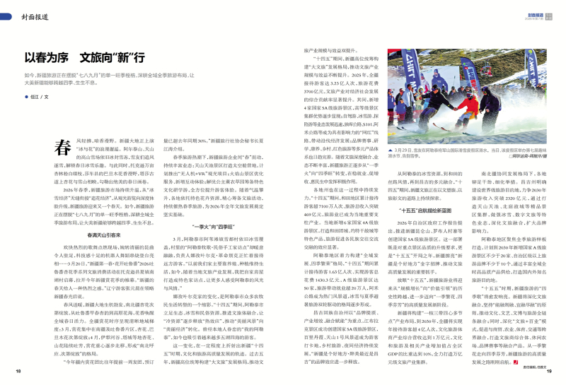 ●任江/文 春风轻拂,暗香漫野。新疆大地正上演“冰与花”的浪漫邂逅。阿尔泰山、天山的高山雪场依旧冰封雪冻,雪友们追风逐雪,解锁春日冰雪乐趣。与此同时,托克逊万亩杏林粉白缀枝,莎车县的巴旦木花香漫野,塔莎古道上杏花与雪山相映,勾勒出绝美的春日画卷。 2026年春季,新疆旅游市场持续升温,从“冰雪经济”无缝衔接“追花经济”,从观光游览向深度体验升级,新疆旅游迎来又一个春天。如今,新疆旅游正在摆脱“七八九月”的单一旺季桎梏,深耕全域全季旅游布局,让大美新疆能够跨越四季、生生不息。 春满天山引客来 欢快热烈的歌舞点燃现场,婉转清丽的昆曲令人驻足,科技感十足的机器人舞蹈串烧登台亮相……3月20日,“新疆第一春·花开吐鲁番”2026吐鲁番杏花季系列文旅消费活动在托克逊县夏镇南湖村启幕,拉开今年新疆赏花季的帷幕。“新疆的春天给人一种热烈之感。”辽宁游客张元晨在领略新疆春光后说。 春风送暖,新疆大地生机勃发,南北疆杏花次第绽放,从吐鲁番早春杏韵到高原花海,花香唤醒全域春日活力。全疆赏花时序呈现清晰地域梯度:3月,赏花集中在南疆及吐鲁番片区,杏花、巴旦木花次第绽放;4月,伊犁河谷、塔城等地杏花、山花陆续吐芳,赏花重心逐步北移,形成“南北呼应、次第绽放”的格局。 “今年疆内赏花团比往年提前一周发团,预订量已超去年同期30%。”新疆旅行社协会秘书长夏江涛介绍。 春季旅游热潮下,新疆旅游企业闻“春”而动,持续丰富业态:天山天池景区打造太空舱营地,计划推出“无人机+VR”观光项目;火焰山景区优化服务、新增互动体验;解忧公主薰衣草园筹备特色文化研学游,全方位提升游客体验。随着气温攀升,各地依托特色花卉资源,精心筹备文旅活动,持续催热春季旅游,为2026年全年文旅发展奠定坚实基础。 “一季火”向“四季旺” 3月,阿勒泰市阿苇滩镇雪都村依旧冰雪覆盖,村里的“阿勒泰牧歌·民俗手工家访点”却暖意融融,负责人娜孜叶尔克·革命别克正忙着接待远方游客。“以前我们家主要靠养殖、种植维持生活,如今,随着当地文旅产业发展,我把自家房屋打造成特色家访点,让更多人感受阿勒泰的风光与风情。” 娜孜叶尔克家的变化,是阿勒泰市众多农牧民生活转型的一个缩影。“十四五”期间,阿勒泰市立足生态、冰雪和民俗资源,推进文旅体融合,让“冷资源”逐步释放“热效应”,推动“美丽风景”向“美丽经济”转化。曾经本地人眷恋的“我的阿勒泰”,如今也吸引着越来越多五湖四海的游客。 这一变化,在一定程度上折射出新疆“十四五”时期,文化和旅游高质量发展的轨迹。过去五年,新疆高位统筹构建“大文旅”发展格局,推动文旅产业规模与效益双提升。