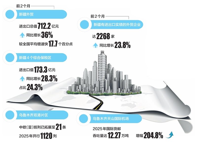 天山网-新疆日报记者 黑宏伟 园区是开放的平台,开放是园区的使命。 乌鲁木齐海关数据显示,今年前2个月,全疆外贸进出口总值712.2亿元,同比增长36%,较全国平均增速快17.7个百分点,交出亮眼成绩单。