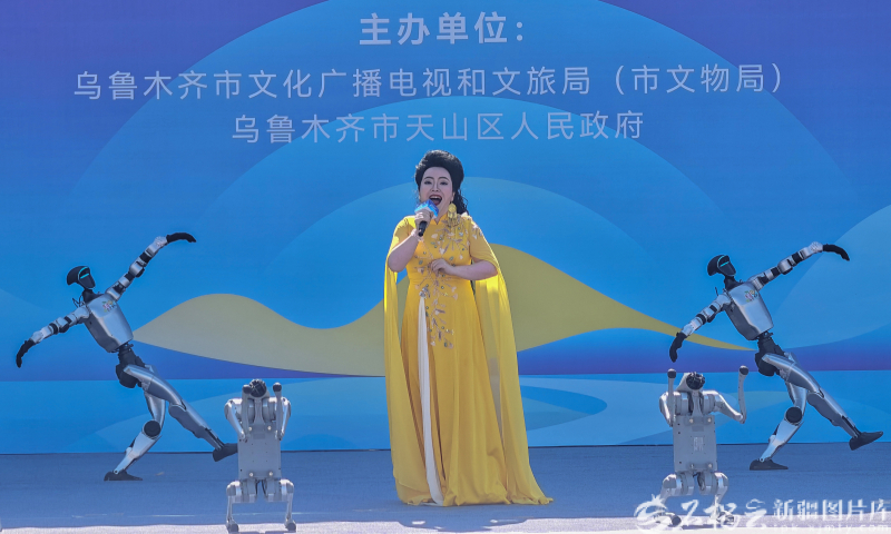 4月19日,演员与机器人表演歌舞。 现场联动新疆生产建设兵团第十二师文化体育广电和旅游局等开展文旅资源推介、特色研学产品发布。文旅行业代表现场宣读服务承诺书,承诺坚守服务初心、规范经营行为、提升服务质量,全力保障游客出行体验。伴随着热烈的氛围,3辆研学大巴缓缓驶出,90名学生踏上研学旅程,开启研学实践之旅。
