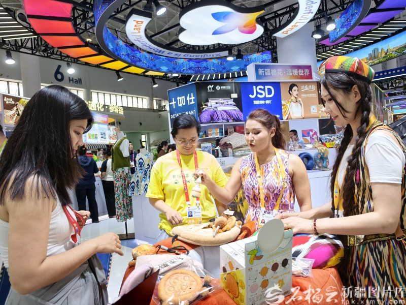 4月15日,在第六届中国国际消费品博览会现场,新疆馆人头攒动。石榴云/新疆日报记者 黑宏伟摄 通透开放的空间布局灵感源自伊宁市六星街,错落有致、层次分明,既显开阔大气,又藏精巧细节。设计团队选取棉花、石榴、丝绸飘带、葡萄、驼队及特色建筑剪影等极具新疆辨识度的视觉元素,以现代展陈手法创新呈现,将浓郁的丝路风情与简约的现代审美完美融合。 现场,金黄酥脆的烤馕在馕坑中滋滋作响,香气四溢;一旁的薰衣草展区,芬芳弥漫,沁人心脾;新疆歌舞表演与产品推介轮番上演,热闹非凡。 “一走进新疆馆就被吸引了,设计很漂亮,东西也特别好,感觉一下子就爱上了新疆。”到访新疆馆的江苏参展商张婷婷感慨道。 独具匠心的展馆设计,不仅是新疆形象的精彩缩影,更成为连接世界、传递友谊的重要窗口。新疆金柔纺织科技有限公司董事长甄彩珍已是第四次参加消博会,她带来了采用新疆优质长绒棉制作而成的艾德莱斯元素披肩、床上四件套和棉纺文创产品。“我们进行了大胆创新,将新疆元素融入产品设计,希望借助消博会平台,让更多人体验新疆家纺产品的独特魅力。”甄彩珍说,展馆的精心设计为产品展示加分不少,也让更多人愿意停下脚步,了解新疆好物。 首次参展的新疆金亿裳服饰有限公司负责人努尔古丽·米吉提对此深有体会,“没想到新疆馆的人气这么旺,很多客商都是被展馆的独特造型吸引过来的,进而了解到我们的产品。我们通过‘公司+家庭工坊+农户’的模式,解决了140余个就业岗位,此次带来的民族特色绣花产品备受青睐,已和上海客商签订了200多万元的订单,与茅台集团、北京客户的合作也在洽谈中。” 向大海—— 八方客商踏浪而来 品质是最好的名片,特色是最强的竞争力。本届消博会上,新疆交易团精心遴选的41家优质企业,凭借得天独厚的资源禀赋和精益求精的匠心工艺,让新疆优品赢得了国内外客商的广泛认可,订单与合作意向纷至沓来。 “销量比预想的好太多。”乌鲁木齐仁泉生物科技有限公司负责人陶仁全介绍,公司多年参加消博会,根据客户反馈意见持续加大科研创新力度,此次带来的新产品实现了生产工艺升级和包装更新换代,不仅受到老客户追捧,还吸引了东南亚客商主动前来洽谈,“我们希望借助消博会平台,让产品真正走出国门、走向世界。” 与往届相比,本届消博会前来洽谈对接的不仅有代理商、经销商,还有很多电商达人。