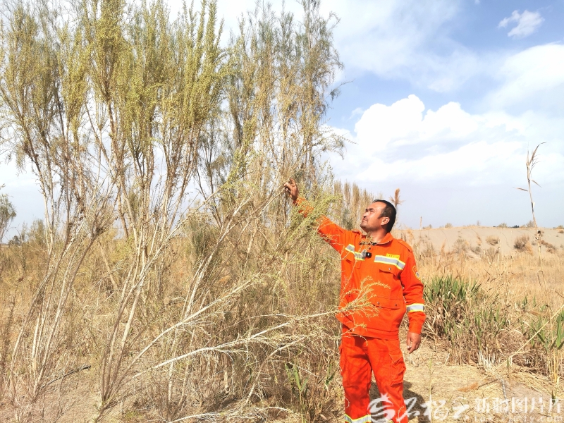 艾西曼区域种植的梭梭林长到了3米多高,护林员玉苏甫江·阿力木在查看梭梭林的生长情况。石榴云/新疆日报记者 曹华摄 每天清晨,玉苏甫江和同事两人一组,骑摩托车带着工具、馕和水出发巡护,平均每天行程100多公里,两三天就能把14万亩人工修复林区走一遍。巡护的日子枯燥而艰辛,白天要清理埋住滴灌带的黄沙、修补被吹断的管道,排查可能发生的火情;晚上还要整理巡护记录。手机,成了他巡护路上最亲密的伙伴,也成了记录艾西曼变迁的“移动相机”。 “2024年9月5日,我第一次拍到大白鹭。”玉苏甫江点开一张照片,屏幕上,一只通体雪白的大鸟正落在电线上休憩,身姿优雅。他回忆说,当时看到这只从未见过的鸟,激动得手都在抖,急忙拍下照片请教他人,才知道这是国家“三有”保护动物大白鹭,偏好栖息在沼泽、湿地等环境中。“这说明咱们的湿地修复有成效了,不然它不会来。”他语气里满是自豪。 如今,玉苏甫江的手机相册早已成了一座“野生动物宝库”。有冬季冰面上不怕人的狐狸,有带着幼崽遛弯的野猪妈妈,有蹦蹦跳跳的塔里木兔,还有随处可见的野鸡等。“你看这张,刺猬缩成一团,憨态可掬;还有这张,狐狸在冰面上奔跑,非常可爱。”他一边滑动屏幕,一边如数家珍,每一张照片、每一段视频背后,都是他与这片土地的深厚情谊,更是艾西曼生态改善的生动佐证。