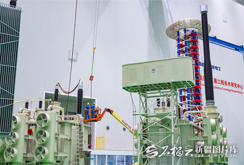 2026年3月31日,在特变电工新疆输变电科技产业园特高压变压器工程技术研究中心,研发人员对组装完成的变压器开展试验前准备工作。何龙摄