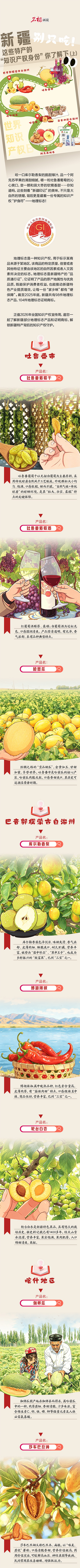 咬一口库尔勒香梨的脆甜爆汁,品一个阿克苏苹果的清甜细腻,嚼一粒吐鲁番葡萄的沁心爽口,尝一颗和田大枣的软糯香甜……你知道吗,这些刻着“新疆印记”的美味,不只是大自然的馈赠,背后更是藏着一份专属的知识产权“护身符”——地理标志! 截至2025年底,新疆共有98件地理标志产品、104件地理标志证明商标。 正值2026年全国知识产权宣传周,邀您一起了解新疆部分地理标志产品和证明商标,解锁新疆特产背后的知识产权守护。 监制:晁瑾 贾永娇 制作:李桢楠 文案:任春香 相关阅读: 石榴画说丨别只吃!新疆这些特产的“知识产权身份”你了解下(下) 责任编辑:巴颜 版权作品,未经授权严禁转载。转载须注明来源、原标题、著作者名,不得变更核心内容。