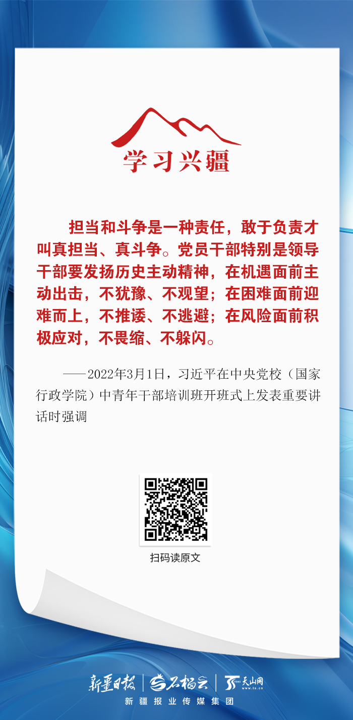 担当和斗争是一种责任,敢于负责才叫真担当、真斗争。党员干部特别是领导干部要发扬历史主动精神,在机遇面前主动出击,不犹豫、不观望;在困难面前迎难而上,不推诿、不逃避;在风险面前积极应对,不畏缩、不躲闪。