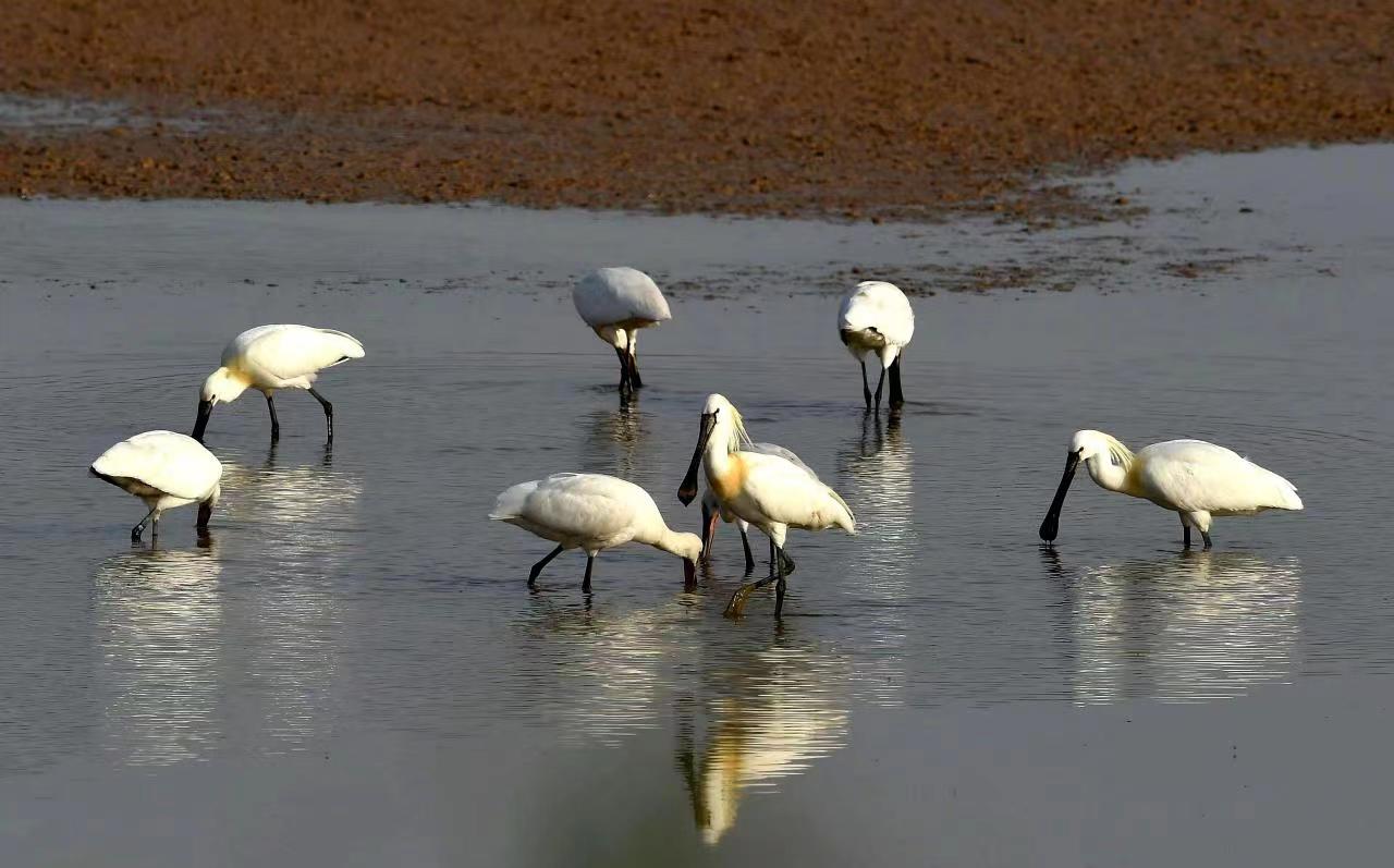 这是4月10日在河南黄河湿地国家级自然保护区孟津段拍摄的白琵鹭。新华社发(马朝红摄)