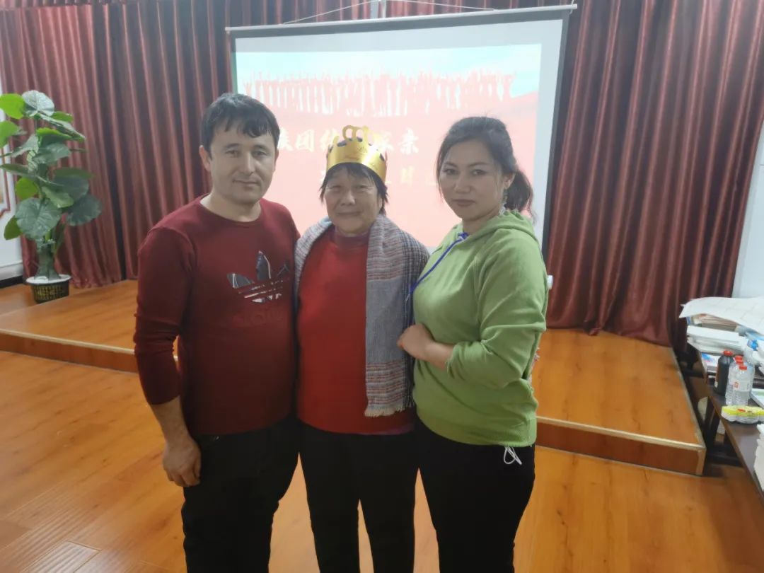 马木提·斯迪克(左)和妻子约日古丽·阿西木(右)给姚淑美(中)庆祝生日。