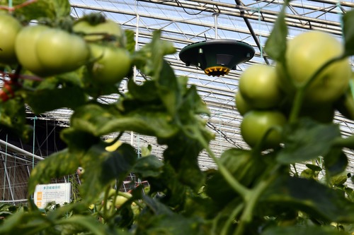在寿光市现代农业高新技术试验示范基地,AI智慧大棚里配备了多功能植保机(4月21日摄)。新华社记者 郭绪雷摄