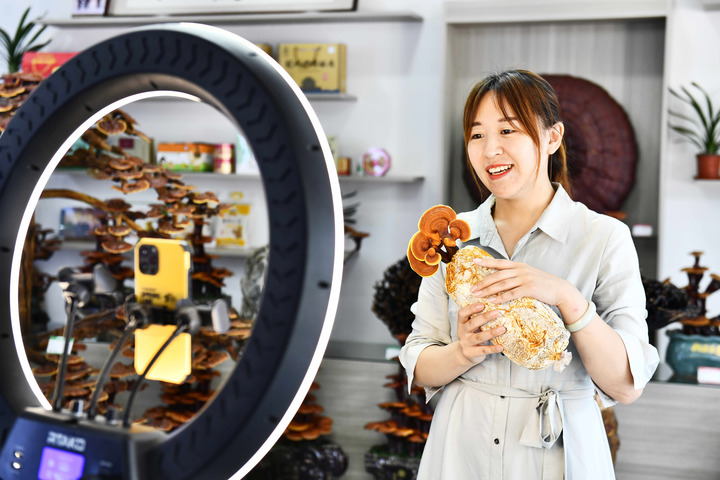 7月9日,在冠县店子镇,主播在进行灵芝直播带货。新华社记者 郭绪雷 摄