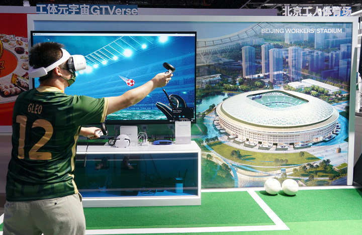 8月28日,在国家会议中心举行的服贸会媒体探营活动中,一名高通公司的工作人员展示工体元宇宙GTVerse。新华社记者 张晨霖 摄