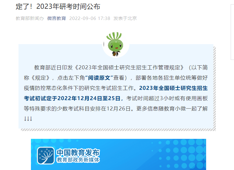 教育部近日印发《2023年全国硕士研究生招生工作管理规定》(以下简称《规定》),部署各地各招生单位统筹做好疫情防控常态化条件下的研究生考试招生工作。2023年全国硕士研究生招生考试初试定于2022年12月24日至25日,考试时间超过3小时或有使用画板等特殊要求的少数考试科目安排在12月26日。更多信息随教育小微一起了解↓↓↓