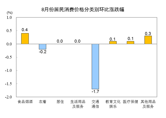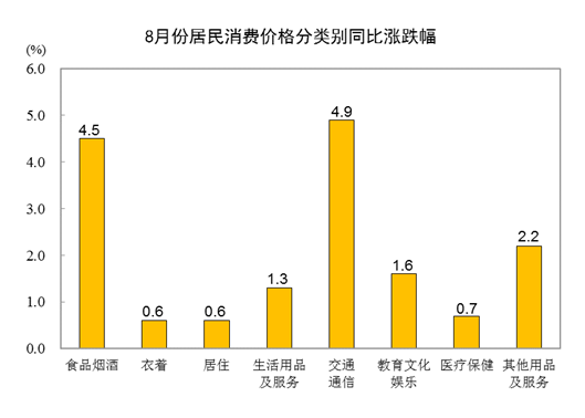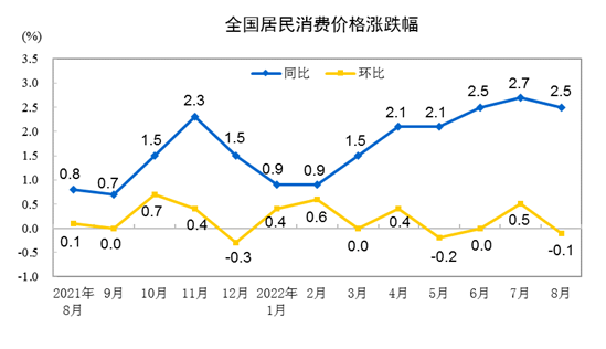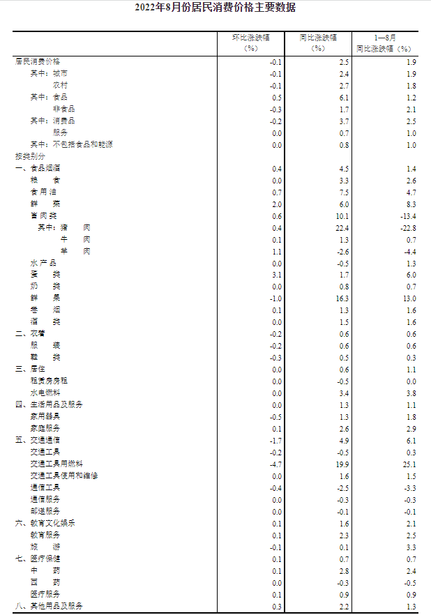 原标题:2022年8月份居民消费价格同比上涨2.5% 环比下降0.1% 2022年8月份,全国居民消费价格同比上涨2.5%。其中,城市上涨2.4%,农村上涨2.7%;食品价格上涨6.1%,非食品价格上涨1.7%;消费品价格上涨3.7%,服务价格上涨0.7%。1—8月平均,全国居民消费价格比上年同期上涨1.9%。 8月份,全国居民消费价格环比下降0.1%。其中,城市下降0.1%,农村下降0.1%;食品价格上涨0.5%,非食品价格下降0.3%;消费品价格下降0.2%,服务价格持平。 一、各类商品及服务价格同比变动情况 8月份,食品烟酒类价格同比上涨4.5%,影响CPI(居民消费价格指数)上涨约1.24个百分点。食品中,鲜果价格上涨16.3%,影响CPI上涨约0.28个百分点;畜肉类价格上涨10.1%,影响CPI上涨约0.32个百分点,其中猪肉价格上涨22.4%,影响CPI上涨约0.30个百分点;鲜菜价格上涨6.0%,影响CPI上涨约0.12个百分点;粮食价格上涨3.3%,影响CPI上涨约0.06个百分点;蛋类价格上涨1.7%,影响CPI上涨约0.01个百分点;水产品价格下降0.5%,影响CPI下降约0.01个百分点。 其他七大类价格同比均上涨。其中,交通通信、其他用品及服务、教育文化娱乐价格分别上涨4.9%、2.2%和1.6%,生活用品及服务、医疗保健价格分别上涨1.3%和0.7%,衣着、居住价格均上涨0.6%。 二、各类商品及服务价格环比变动情况 8月份,食品烟酒类价格环比上涨0.4%,影响CPI上涨约0.10个百分点。食品中,蛋类价格上涨3.1%,影响CPI上涨约0.02个百分点;鲜菜价格上涨2.0%,影响CPI上涨约0.04个百分点;畜肉类价格上涨0.6%,影响CPI上涨约0.02个百分点,其中猪肉价格上涨0.4%,影响CPI上涨约0.01个百分点;鲜果价格下降1.0%,影响CPI下降约0.02个百分点。 其他七大类价格环比三涨两平两降。其中,其他用品及服务、教育文化娱乐、医疗保健价格分别上涨0.3%、0.1%和0.1%;居住、生活用品及服务价格均持平;交通通信、衣着价格分别下降1.7%和0.2%。 编辑:唐颢宸