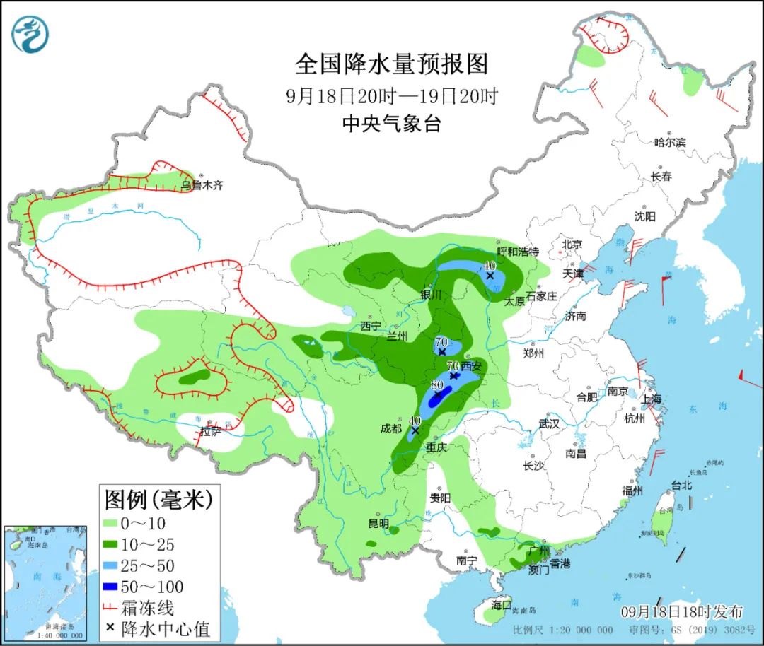 9月18日20时至19日20时,内蒙古中西部、青海东部、甘肃河西、宁夏北部和南部、陕西北部和西南部、山西中北部、四川盆地东部、广东西南部等地部分地区有中到大雨,其中,陕西中南部、四川盆地东北部等地部分地区有暴雨。