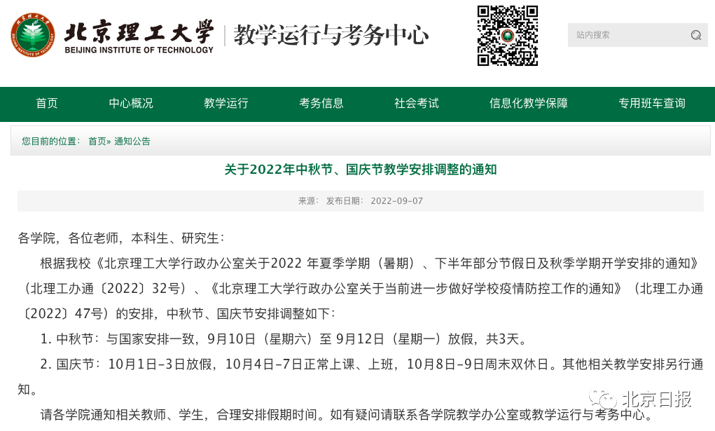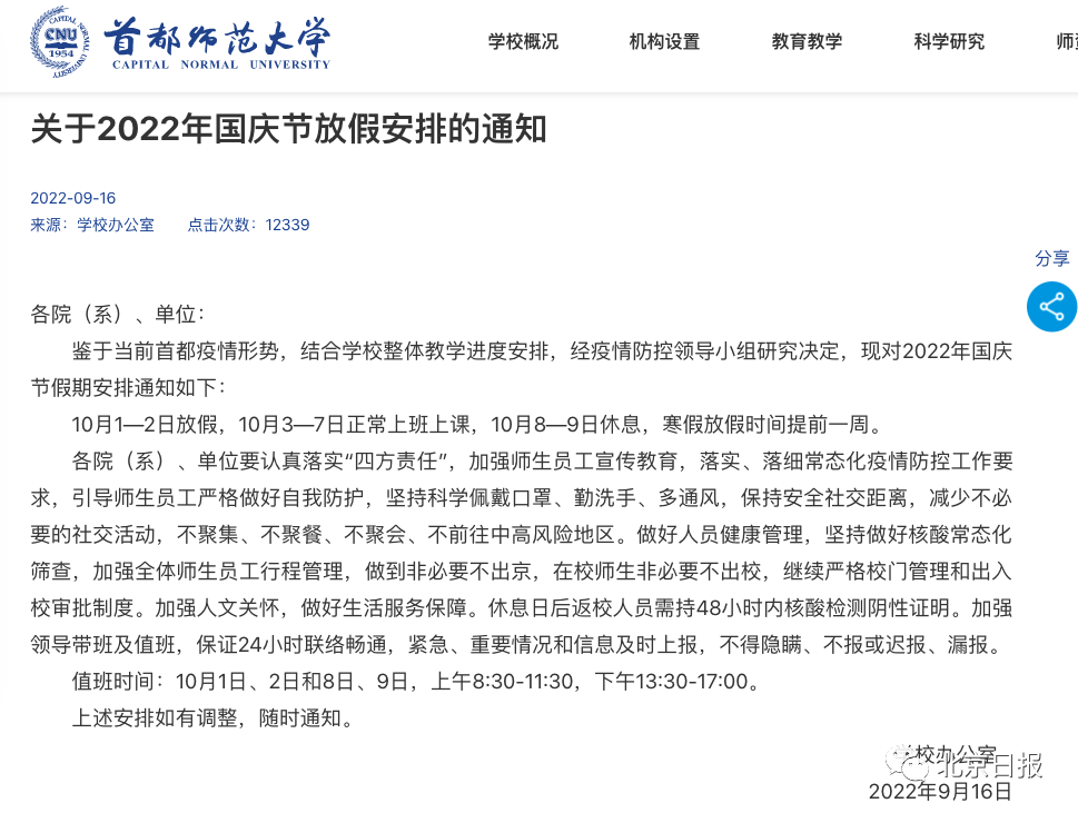 10月1日至2日放假,10月3日至7日正常上班上课,10月8日至9日休息,寒假放假时间提前一周。