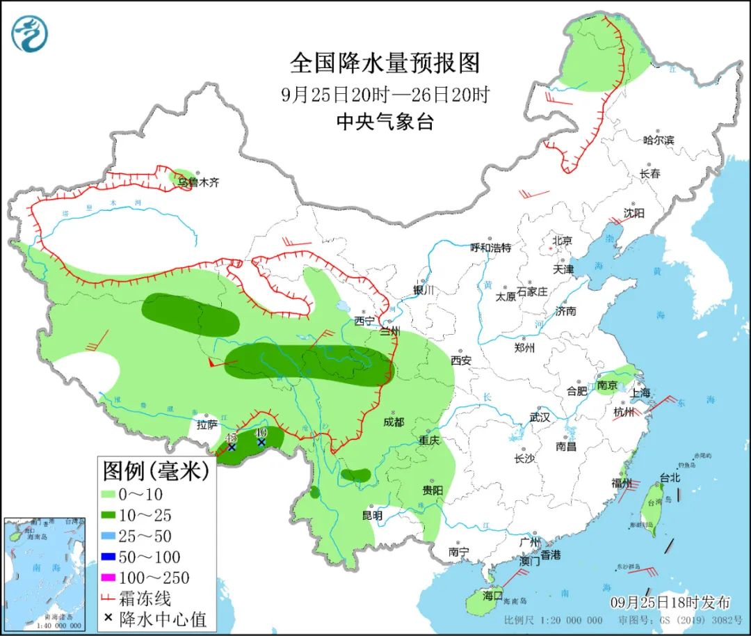 9月25日20时至26日20时,西藏、青海、四川、重庆、贵州、云南等地部分地区有小到中雨,其中,西藏东南部等地局地有大雨。