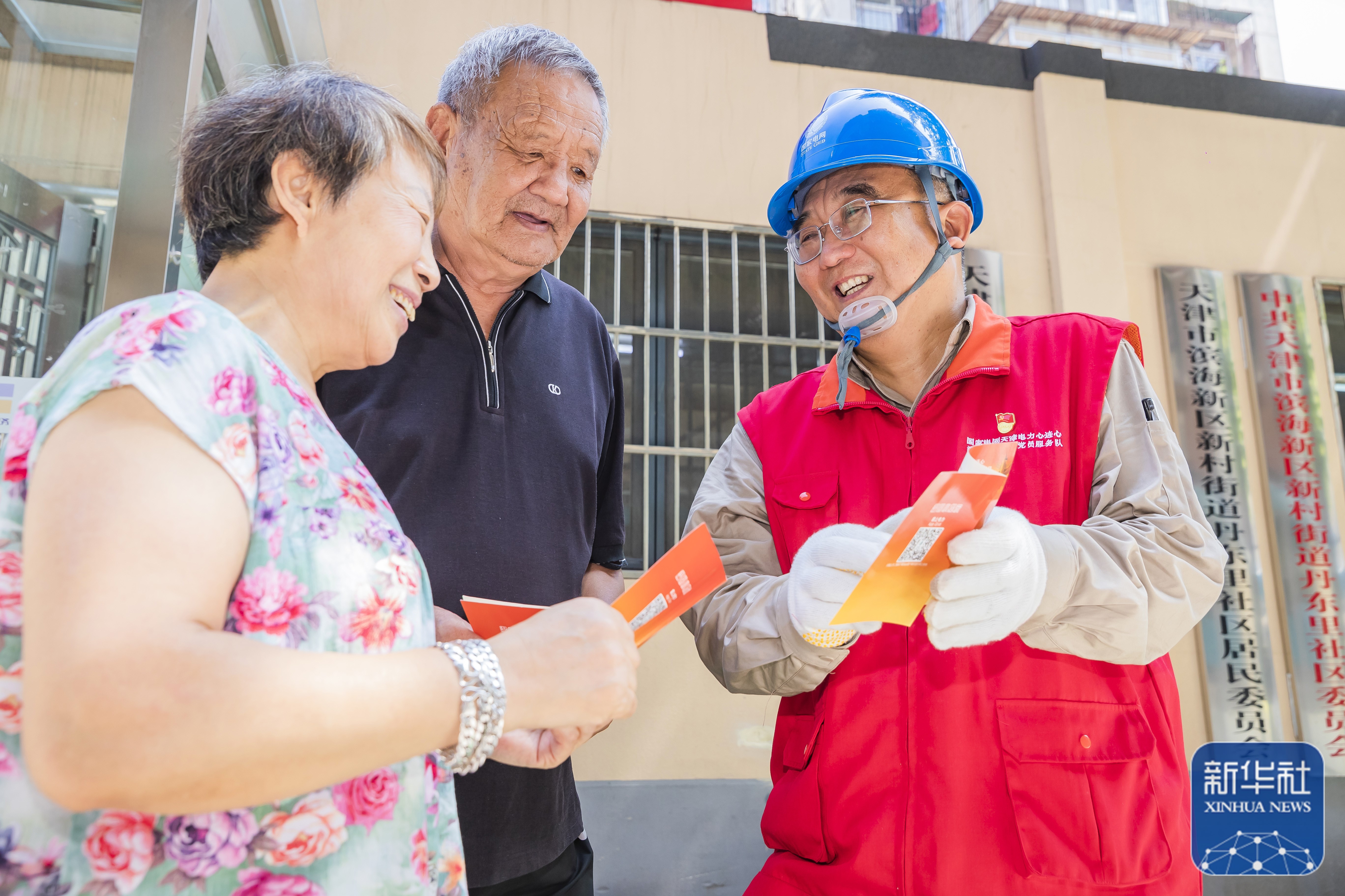 张黎明(右)在天津市滨海新区丹东里小区向居民宣讲安全用电常识(2022年7月15日摄)。新华社发(李津摄)