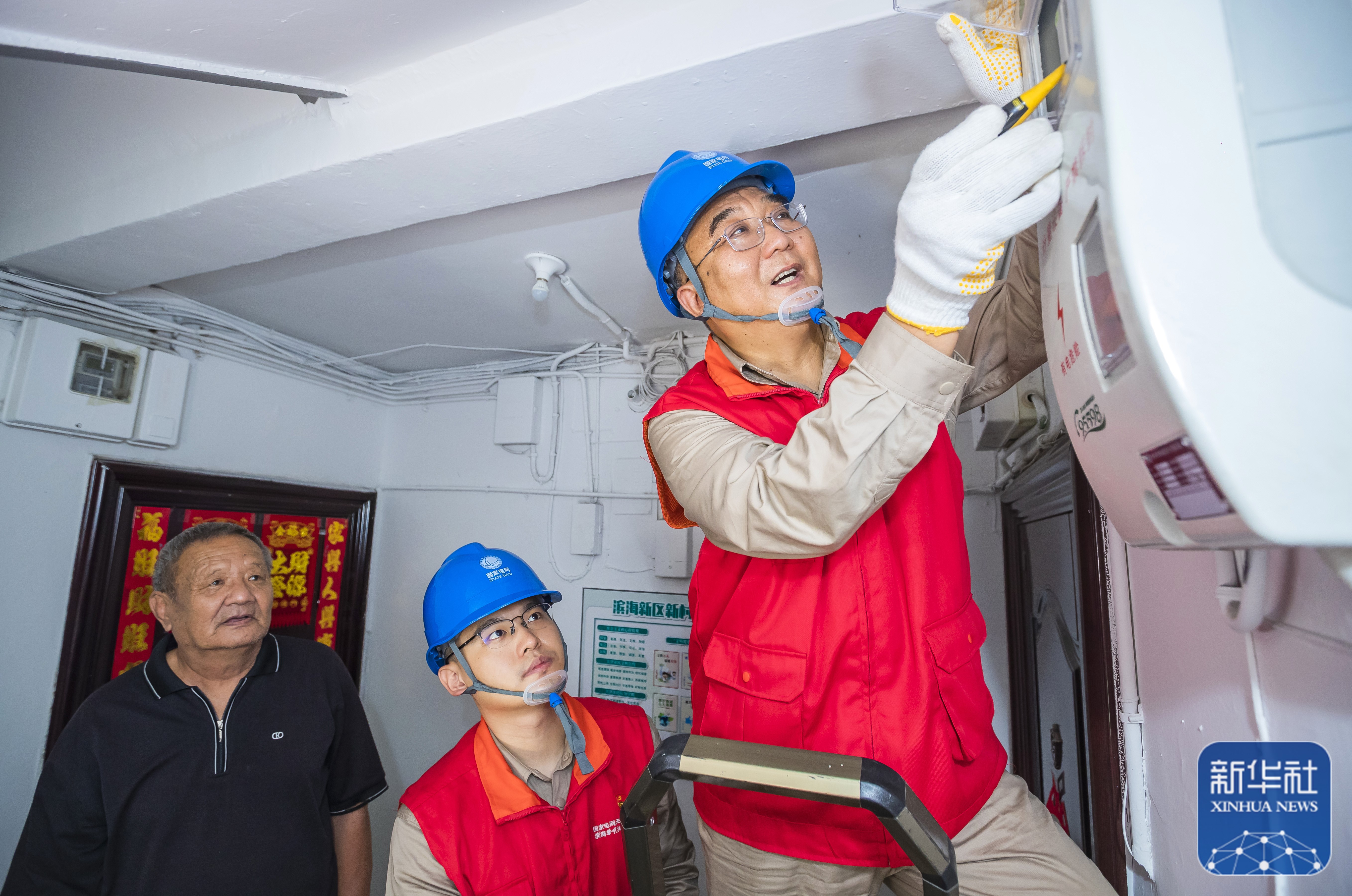 张黎明(右)带领国网天津滨海黎明共产党员服务队到天津市滨海新区丹东里小区为居民查看电表(2022年7月15日摄)。新华社发(李津摄)